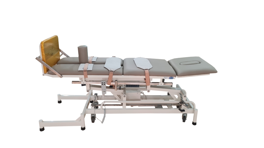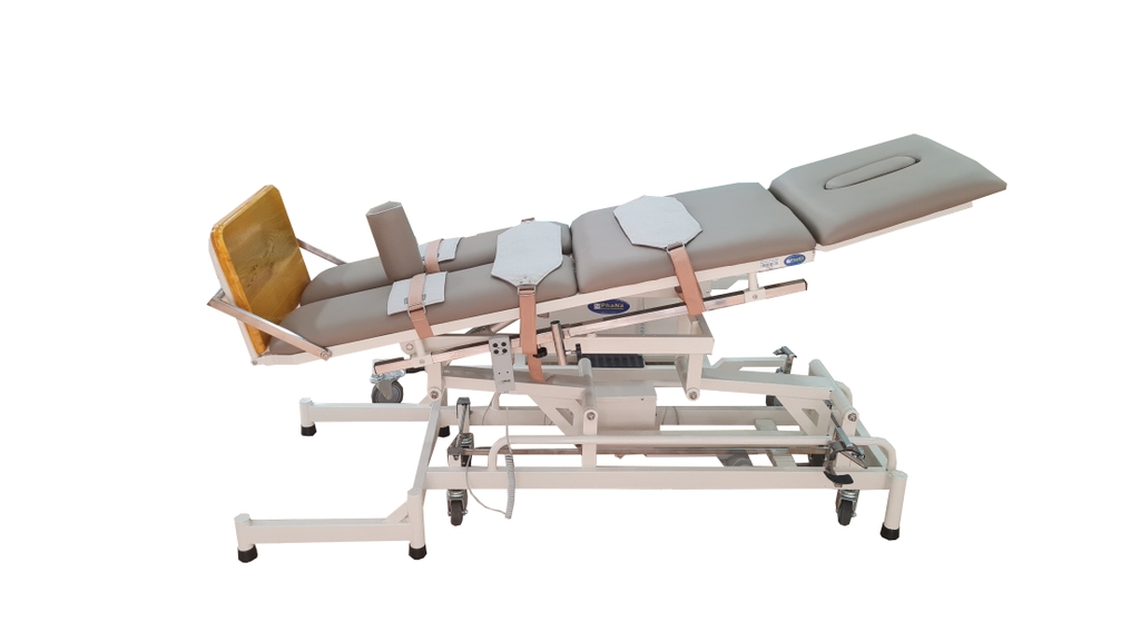 Tập đứng cho người bị co rút các khớp. Giường có thể điều chỉnh điện từ vị thế nằm sang vị thế thẳng đứng, có tựa tay và đai buộc để giữ chặt các khớp khi tập đứng . Dùng tập đứng cho các trường hợp bị yếu liệt tứ chi lâu ngày các khớp bị co rút không có khả năng tập đứng trong khung tập đi song song và dụng cụ hổ trợ khác.