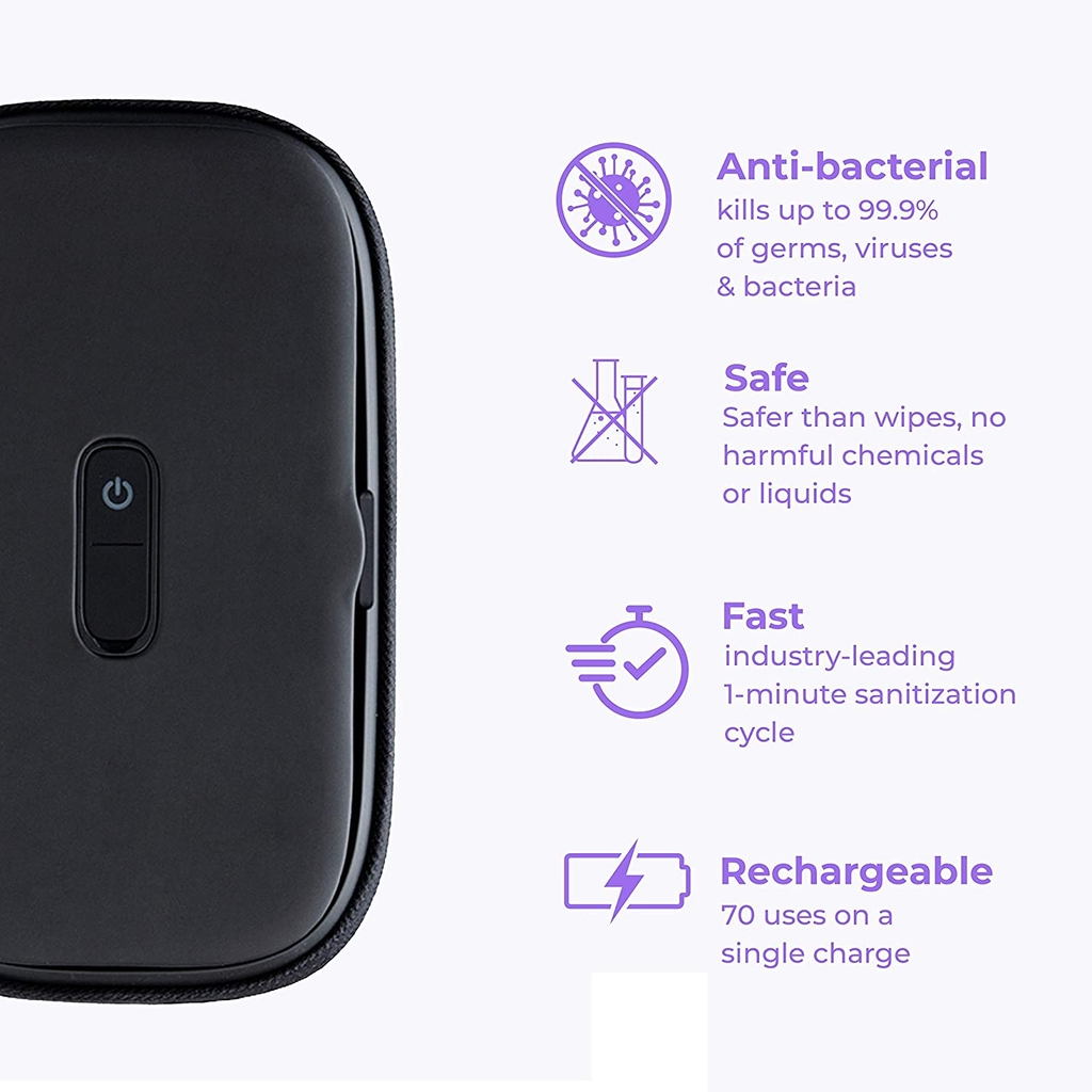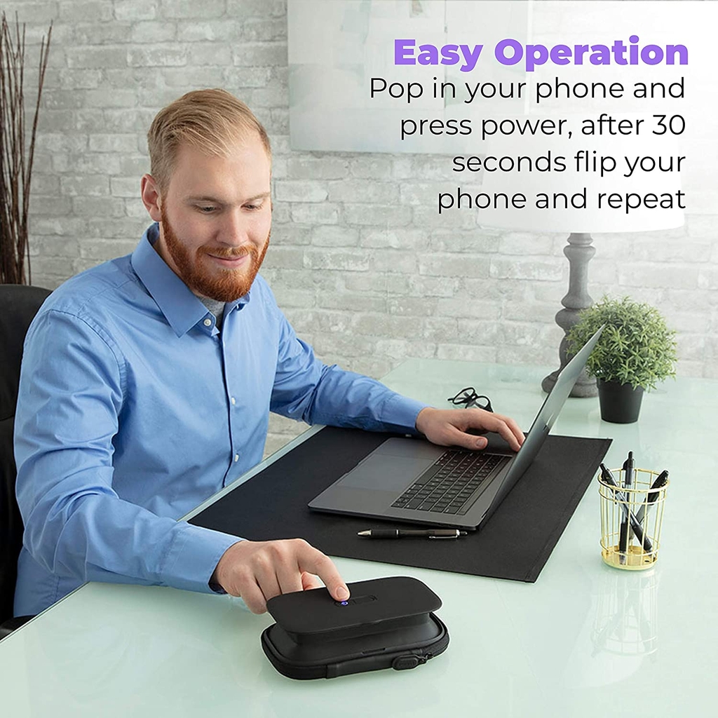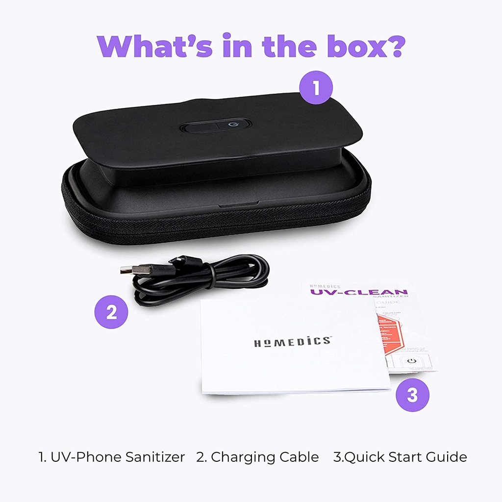 - HoMedics SAN-PH100 một thiết bị khử khuẩn điện thoại mini với công nghệ diệt khuẩn hiệu quả nhất hiện nay : công nghê diệt khuẩn UV-C. Sản phẩm có khả năng diệt sạch vi khuẩn lên đến 99,99%, hiệu quả gấp 10 lần so với các chất khử khuẩn thông thường, thời gian khử khuẩn toàn bộ chiếc điện thoại của bạn chỉ trong vòng 1 phút .