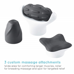 - 3 Đầu phụ kiện đi kèm cho massage tùy chỉnh : Một đầu cho khu vực masage rộng , một đầu massage lăn để massage các vị trí nhỏ hơn và một đầu để massage tại một điểm để giảm đau hiệu quả .