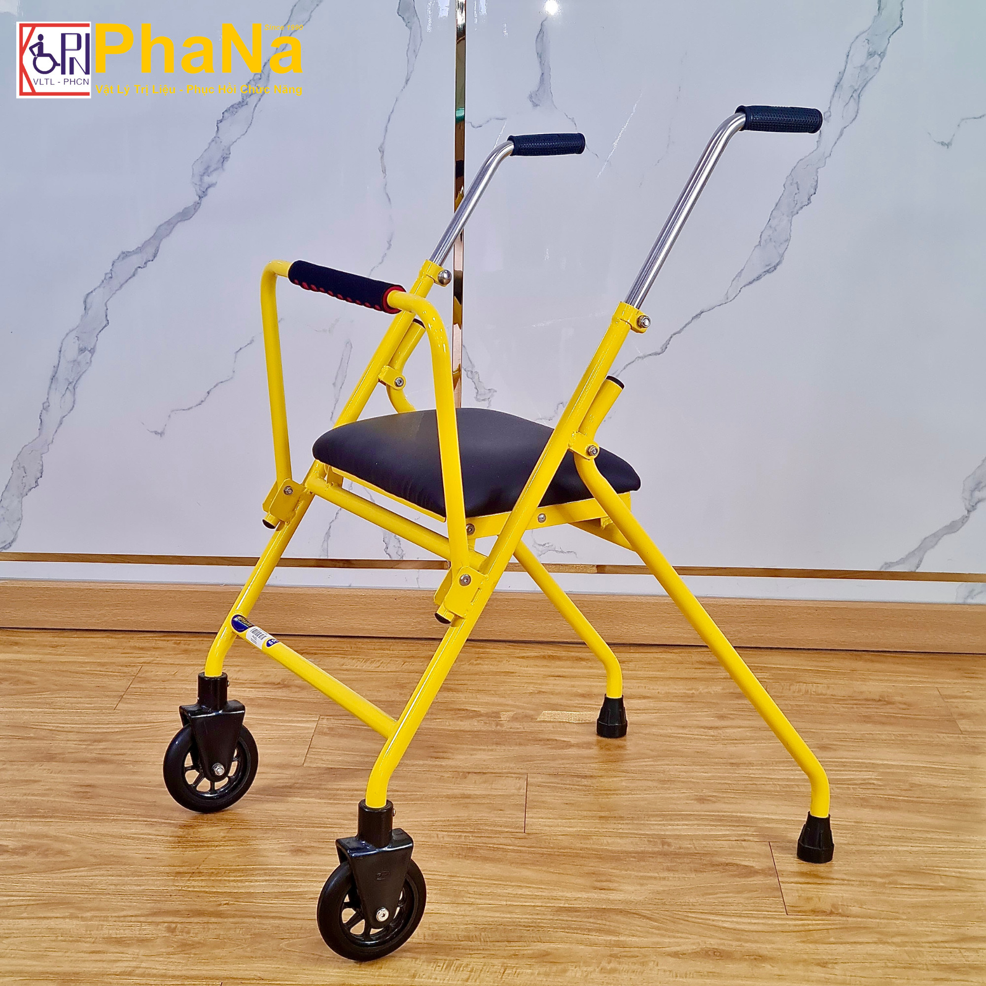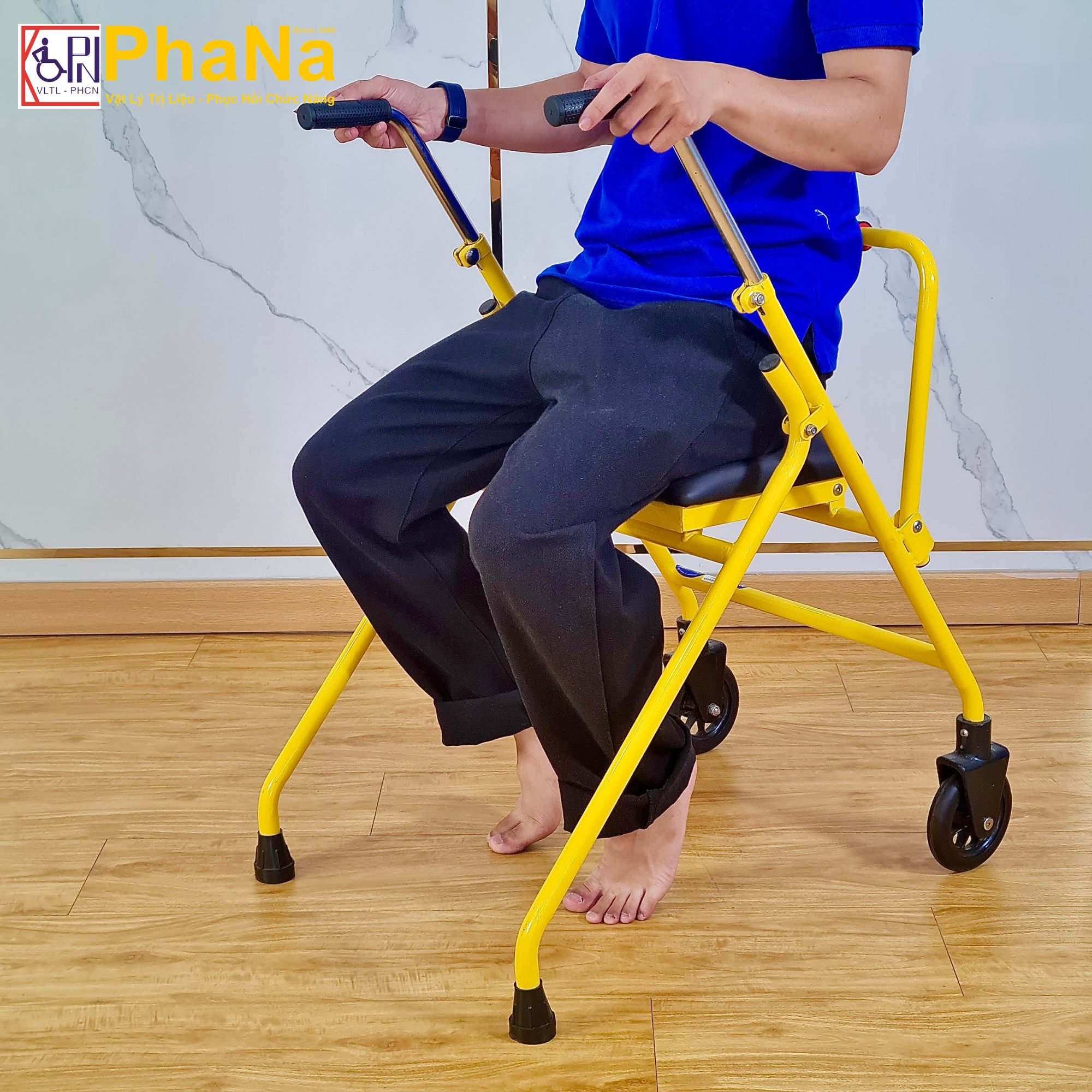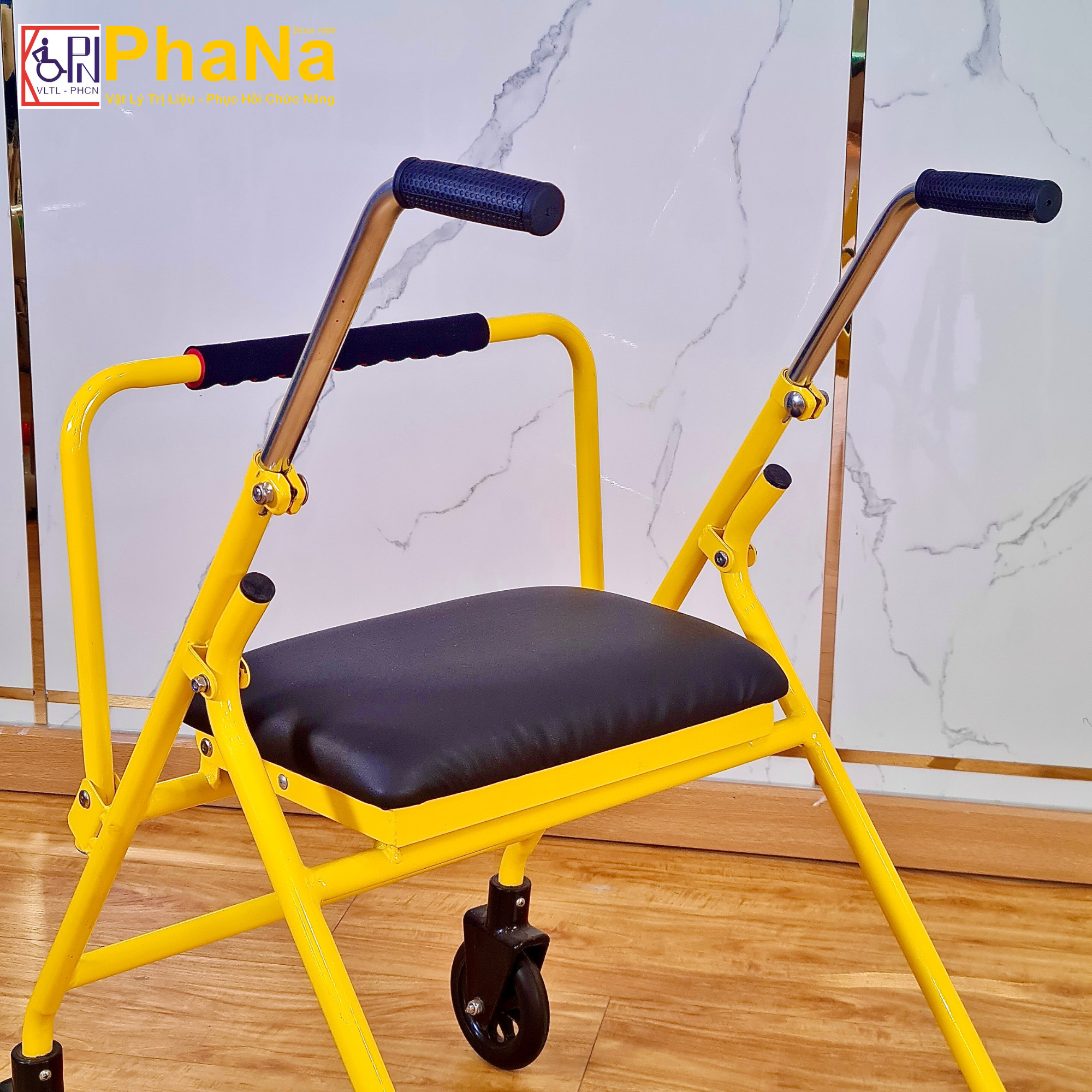 - Dùng để tập đi, có chỗ ngồi giúp người bệnh có thể ngồi nghỉ tạm khi đang tập đi bị mệt cần ngồi nghỉ tại chỗ. Có thể xếp gọn