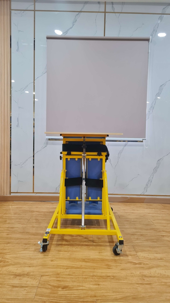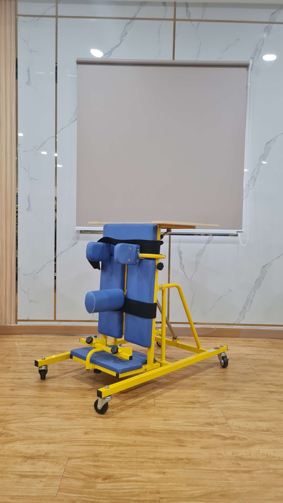 - Dụng cụ này có thể điều chỉnh từ 0 – 90 độ ( từ tư thế nằm đến tư thế đứng thẳng ) , có dây đai để cố định các khớp bị co rút và đặc biêt nhất là loại này có cục nâng đở(có thể tháo rời) bằng mouse êm để ở giữa 2 khớp hông mục đích trợ giúp trẻ không bị tụt xuống khi đứng và ngăn ngừa co rút khép khớp hông .