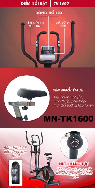 - Xe đạp tập thể dục Tokado TK 1600 được thiết kế đẹp mắt + chắc chắn, có chức năng tập vận động toàn thân hiệu quả và phù hợp sử dụng cho hộ gia đình. Đây là mẫu xe đạp thể dục "2 trong 1", vừa hỗ trợ chức năng đứng đạp xe và vừa tích hợp yên để người dùng có thể ngồi tập. Thiết kế chi tiết của xe đạp Tokado TK 1600 gồm có: