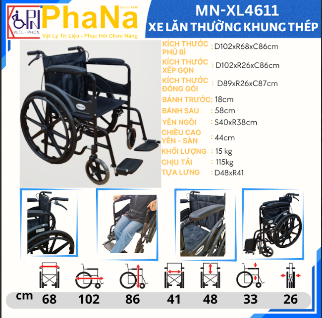 - Tựa tay cố định có nệm, gác chân có thể tháo rời nhanh tăng cao thấp